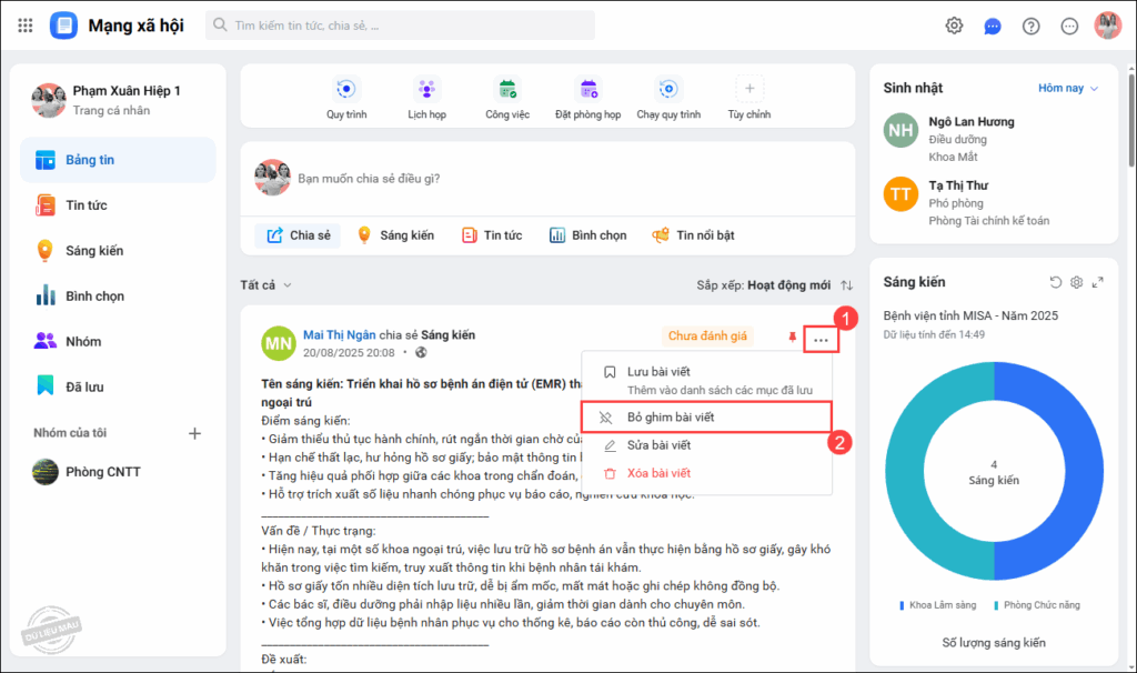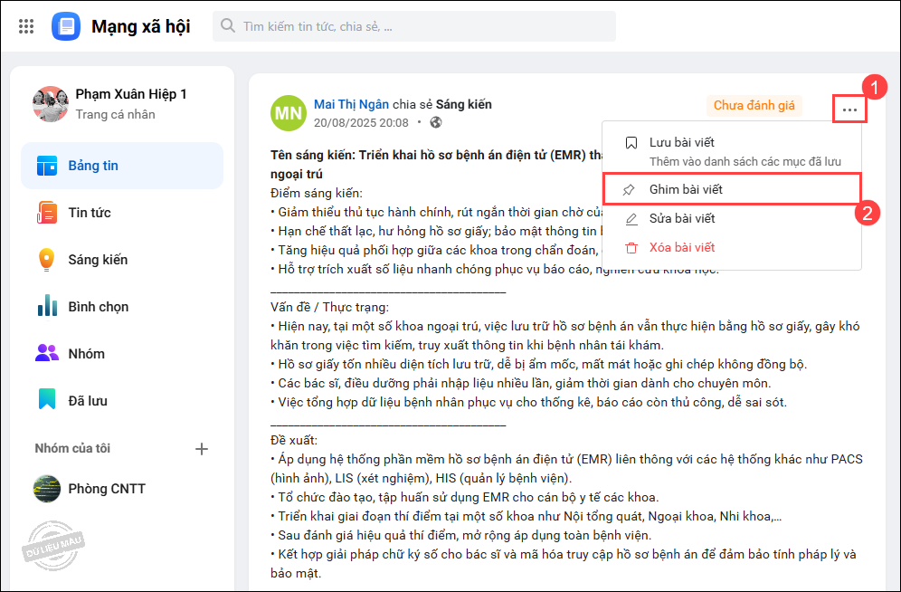 - Trường hợp anh/chị muốn bài viết quan trọng hiển thị cố định ở đầu Bảng tin, nhấn vào biểu tượng ⋯, chọn Ghim bài viết.
