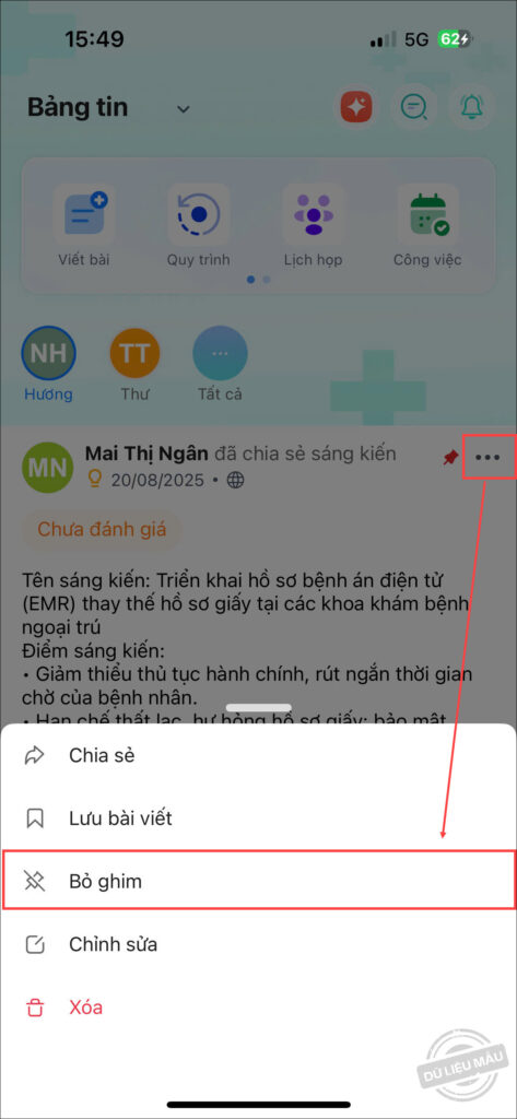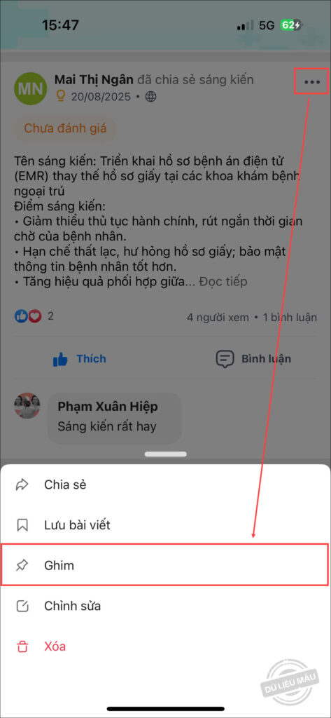- Trường hợp anh/chị muốn bài viết quan trọng hiển thị cố định ở đầu Bảng tin, nhấn vào biểu tượng ⋯, chọn Ghim.