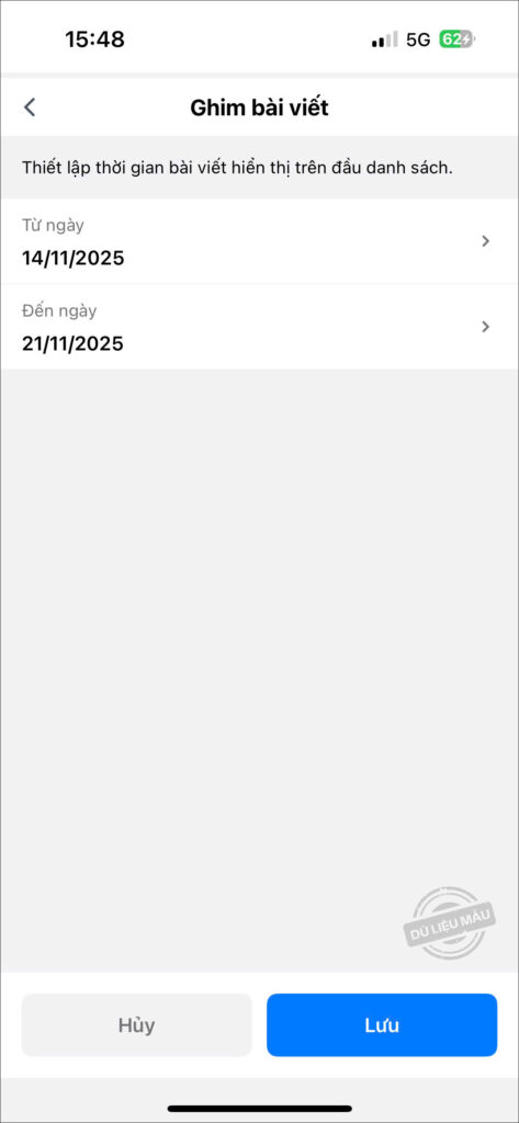- Thiết lập thời gian ghim bài viết. Nhấn Lưu.