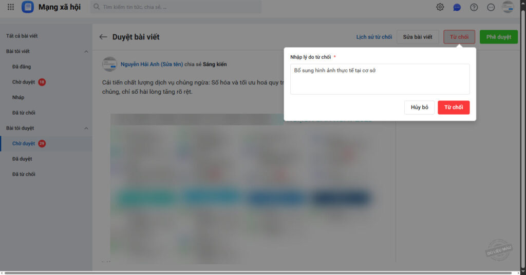 • Nếu từ chối duyệt bài viết thì chọn Từ chối. Nhập lý do từ chối, sau đó nhấn Từ chối.