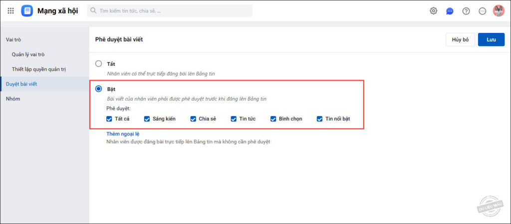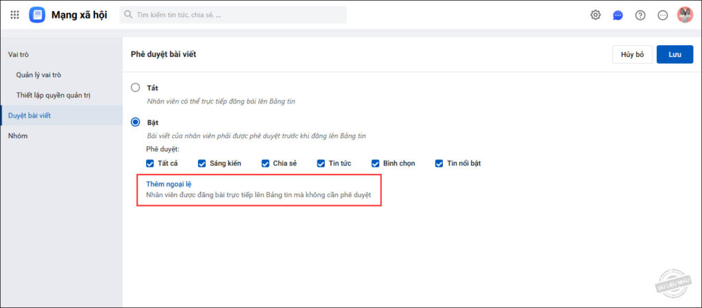 • Trường hợp muốn cho phép một số nhân viên được đăng bài trực tiếp mà không cần qua phê duyệt, chọn Thêm ngoại lệ.