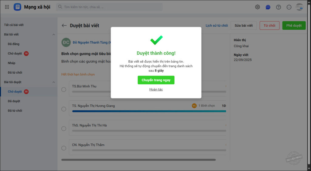 • Nếu đồng ý phê duyệt bài viết thì chọn Phê duyệt. Hệ thống sẽ thông báo duyệt thành công và bài viết sẽ hiển thị trên bảng tin.