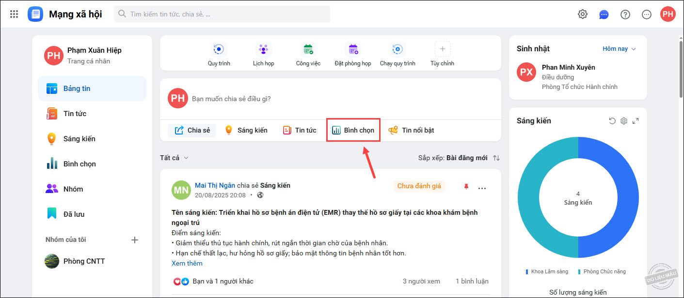 1. Trên giao diện Bảng tin, tại phần chia sẻ bài viết, nhấn Bình chọn.