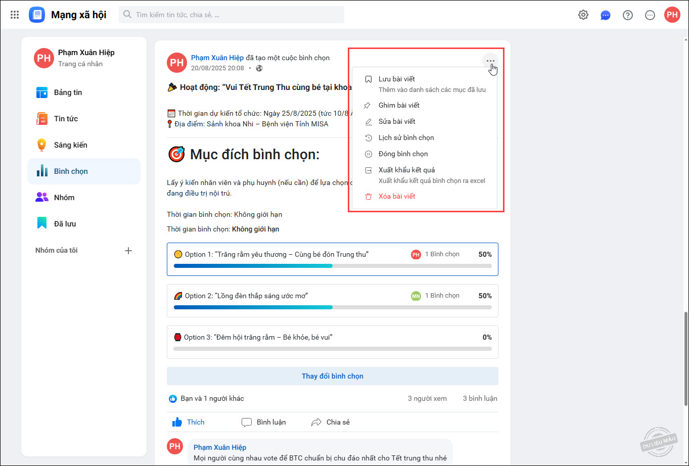 8. Sau khi đăng bình chọn, có thể nhấn vào biểu tượng 3 chấm để thực hiện các chức năng: