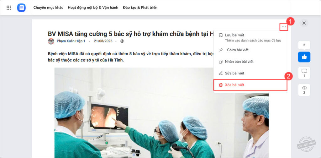- Để xóa bài viết, nhấn vào biểu tượng ⋯, chọn Xóa, bài viết sẽ không còn hiển thị trên Bảng tin và trang cá nhân của anh/chị.