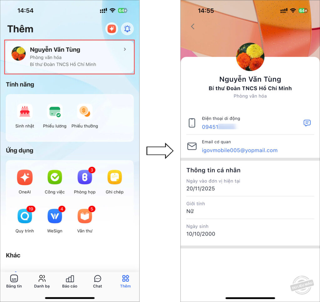 2. Nhấn vào phần tên người dùng để xem thông tin cá nhân như: Họ tên, ngày sinh, số điện thoại, email,…