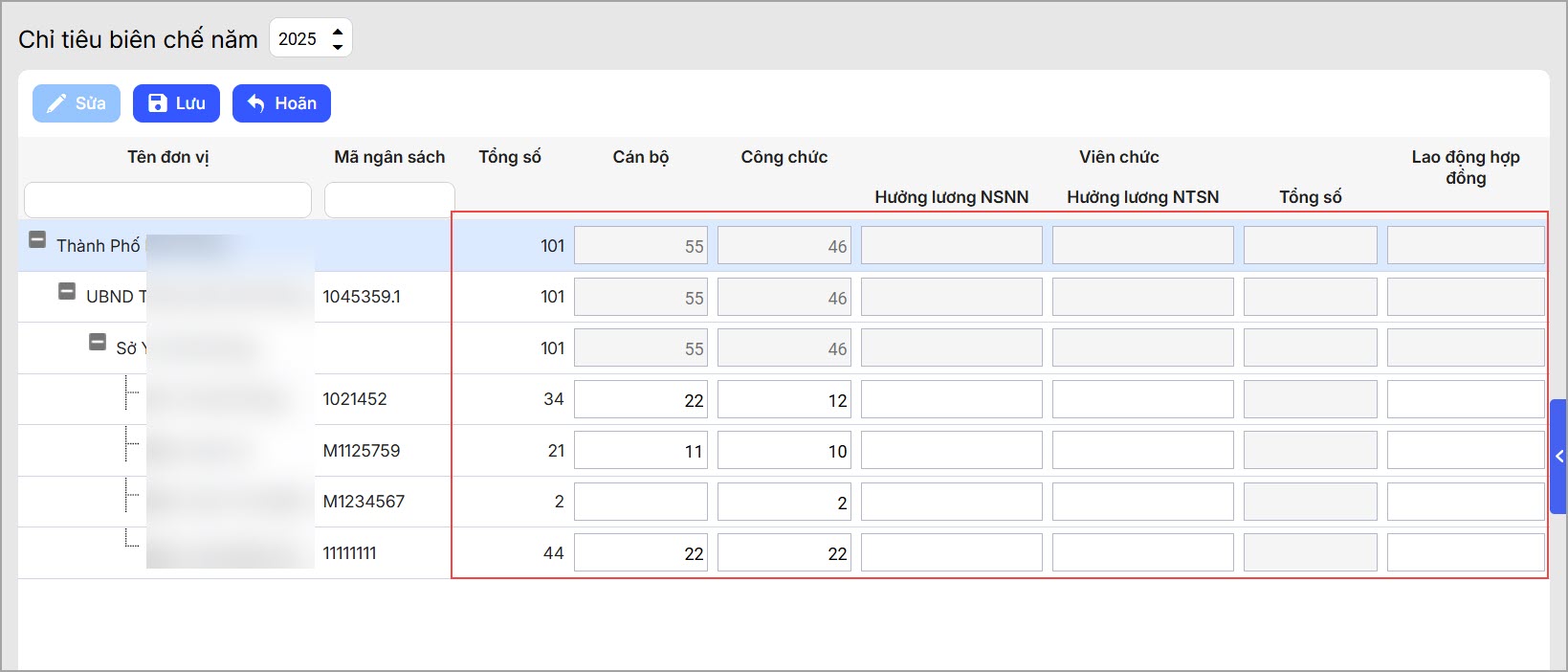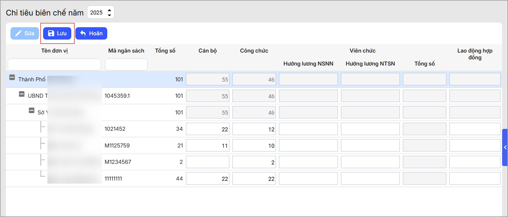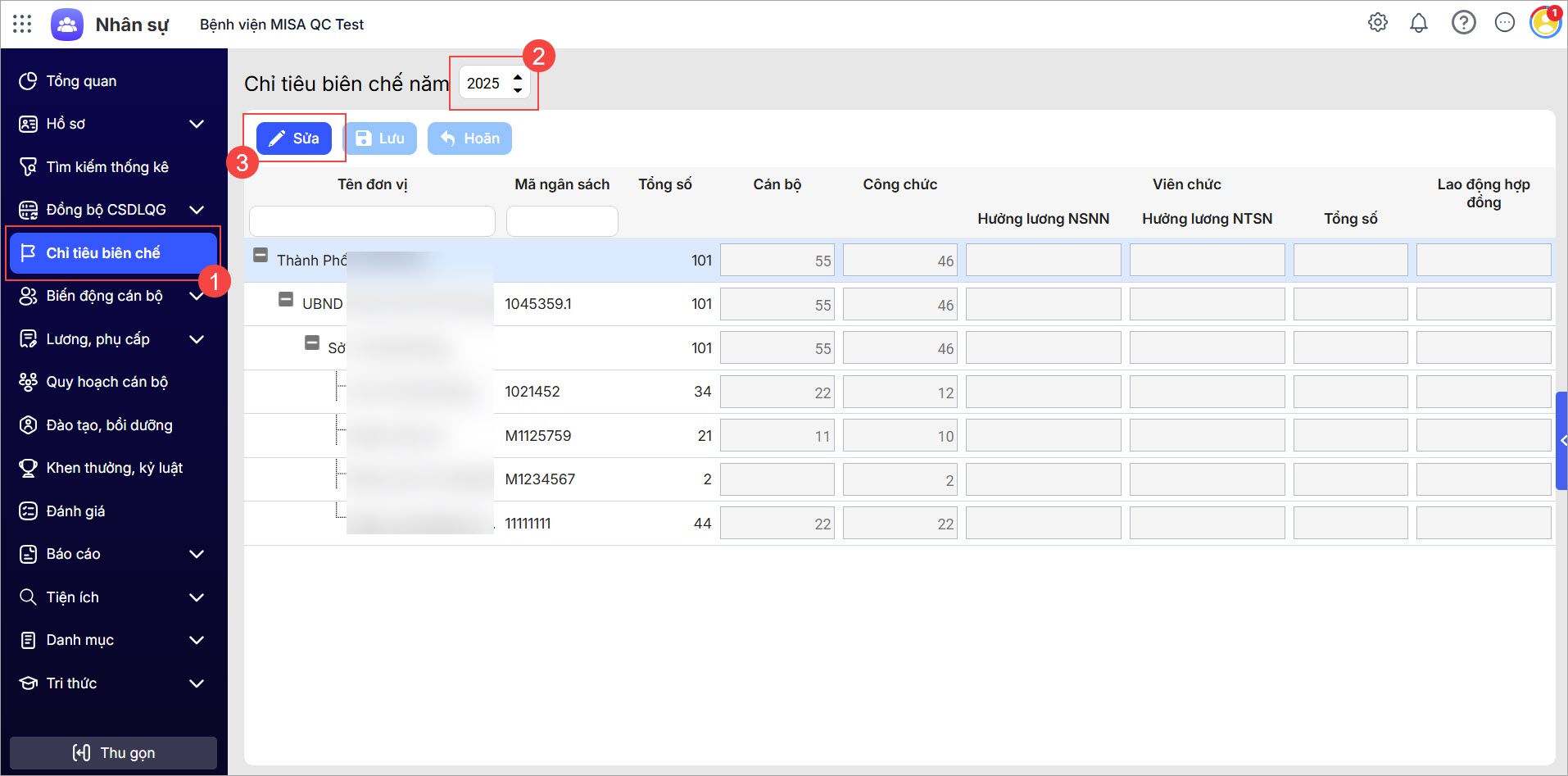 - Vào Chỉ tiêu biên chế, chọn Năm ghi nhận chỉ tiêu biên chế và nhấn Sửa.