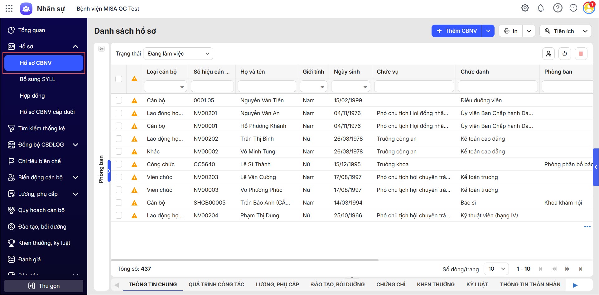 • Nhấn Thêm để mở màn hình nhập liệu chi tiết các thông tin hồ sơ CBNV.