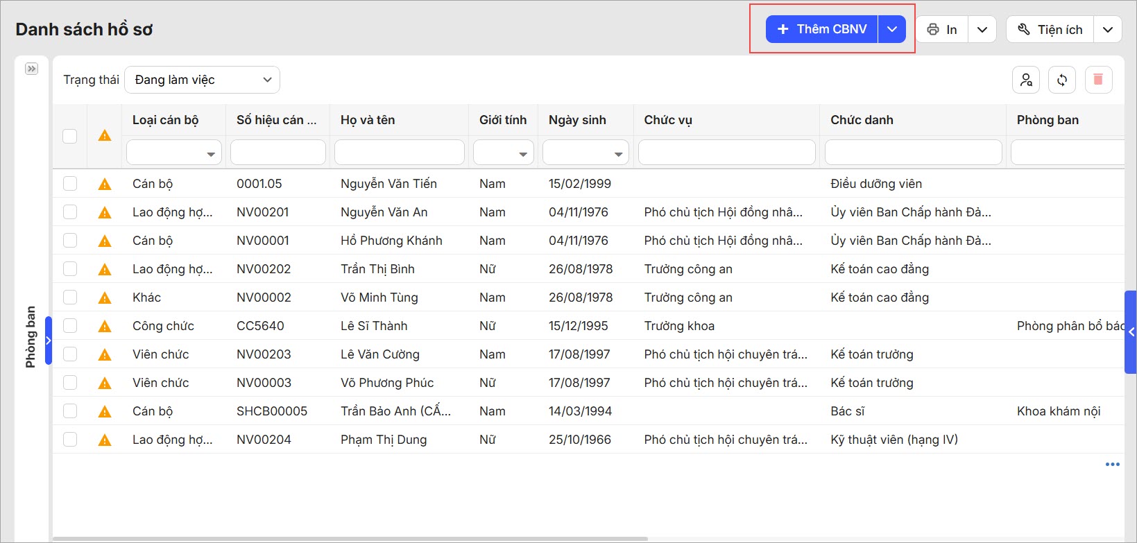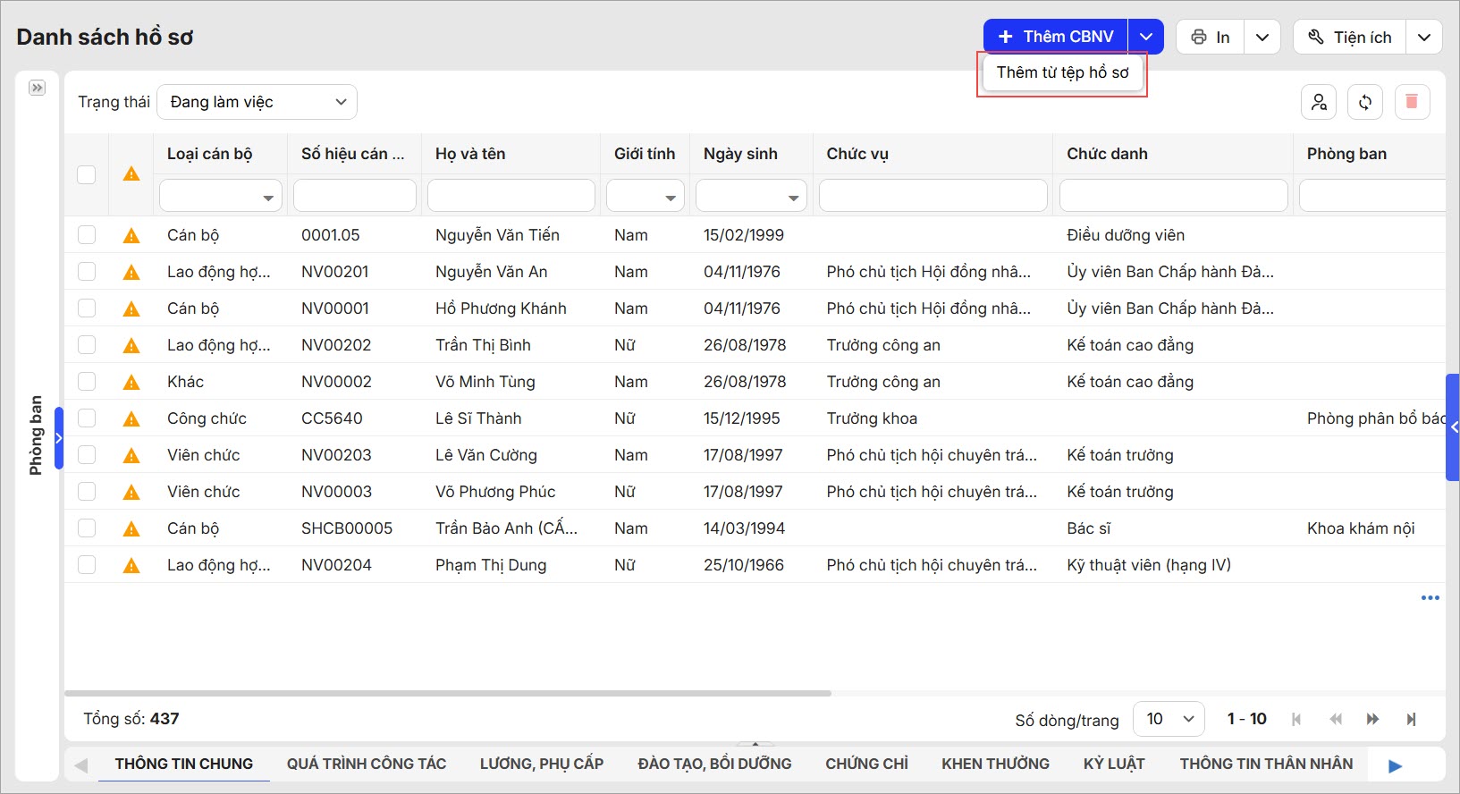 Cách 1: Thêm mới hồ sơ CBNV