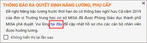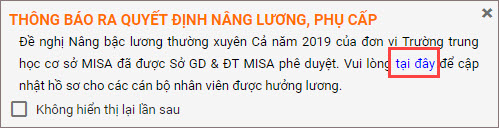 9. Sau khi được cấp trên phê duyệt, đơn vị đăng nhập vào phần mềm và thấy thông báo. Nhấn tại đây (hoặc vào menu Hồ sơ\Nâng lương, phụ cấp) để cập nhật hồ sơ.