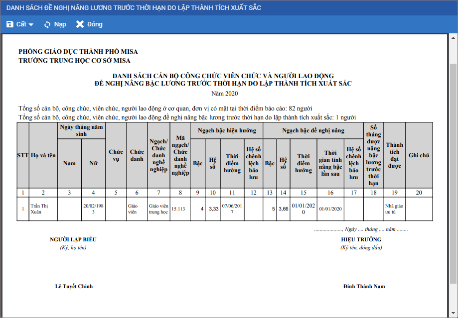 10. Nhấn In để in danh sách CBCCVC và người lao động đề nghị nâng bậc lương trước thời hạn do lập thành tích xuất sắc.