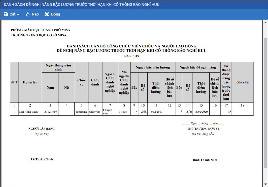 6. Nhấn In để in danh sách CBCCVC và người lao động đề nghị nâng bậc lương trước thời hạn do có thông báo nghỉ hưu