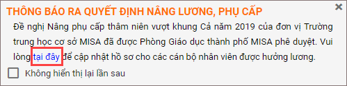 12. Sau khi được cấp trên phê duyệt, đơn vị đăng nhập vào phần mềm và thấy thông báo. Nhấn tại đây trên câu thông báo (hoặc vào menu Hồ sơ\Nâng lương, phụ cấp) để cập nhật hồ sơ.