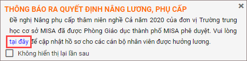 11. Sau khi được cấp trên phê duyệt, đơn vị đăng nhập vào phần mềm và thấy thông báo. Nhấn tại đây (hoặc vào menu Hồ sơ\Nâng lương, phụ cấp) để cập nhật hồ sơ.