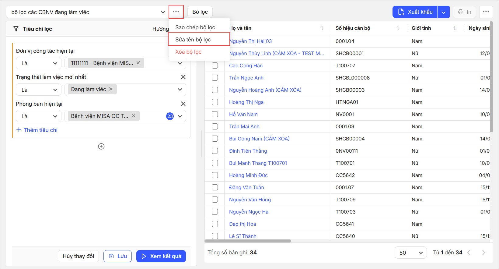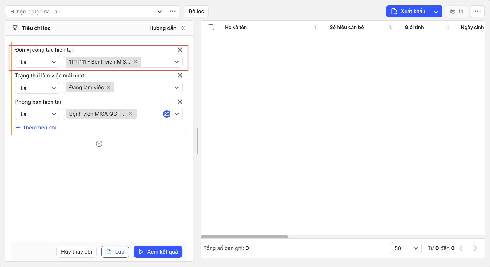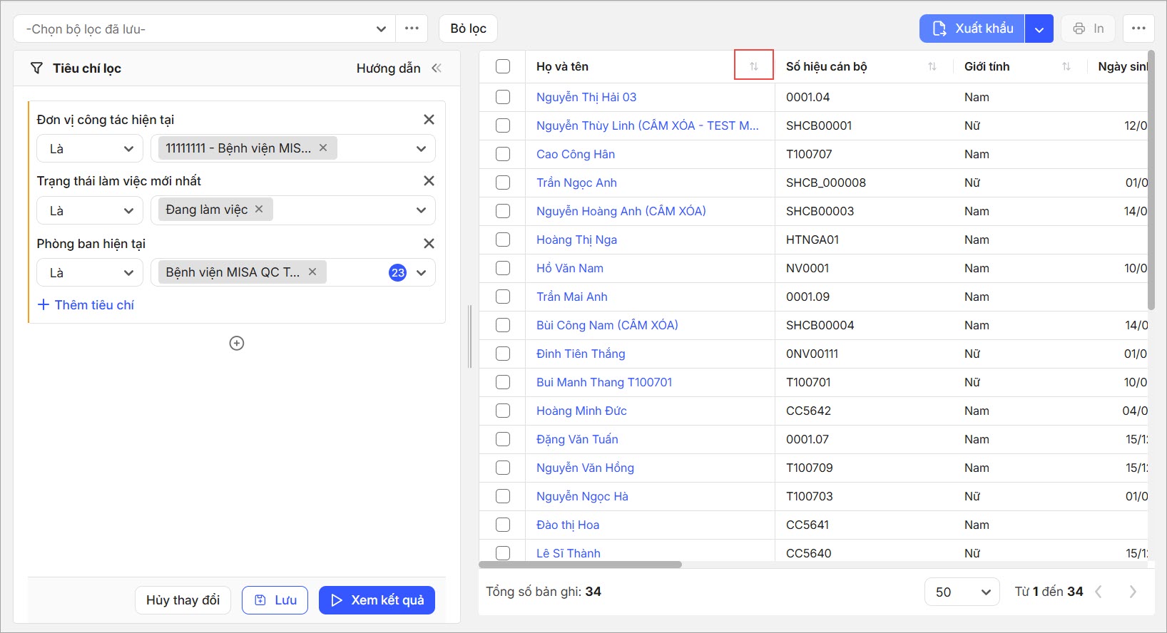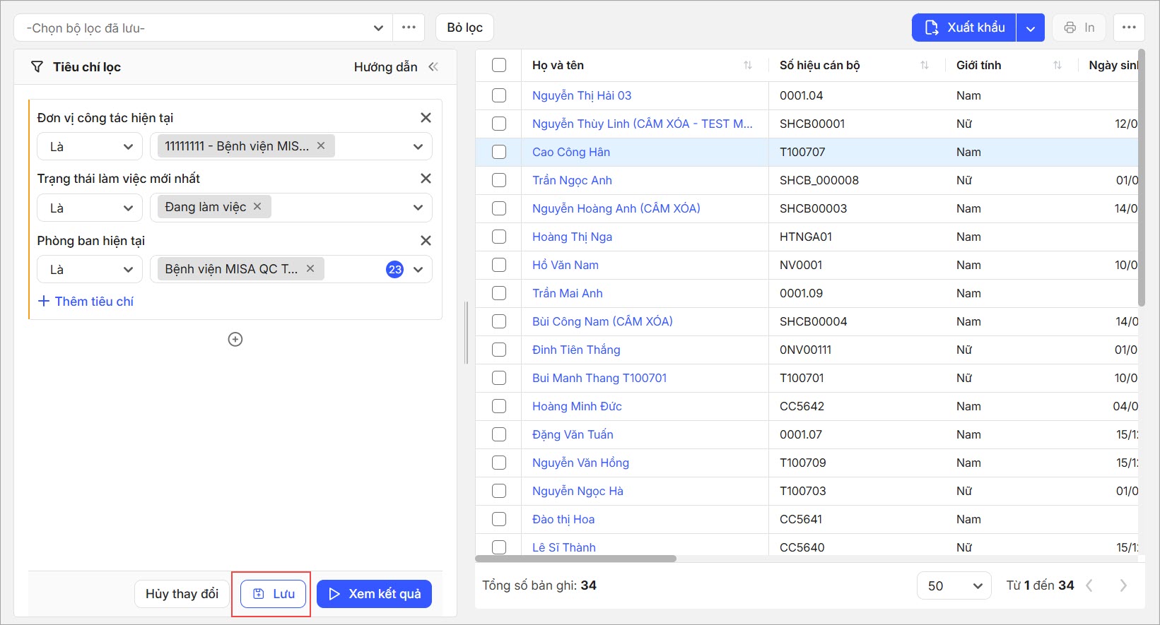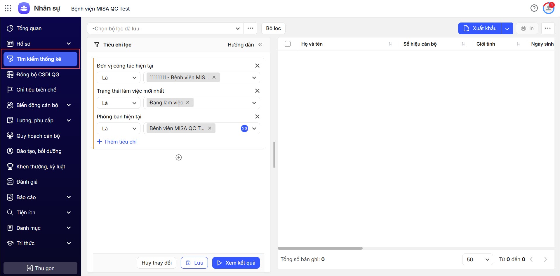 6. Có thể nhấn Xuất khẩu để xuất khẩu danh sách CBNV sau khi thống kê ra file excel.