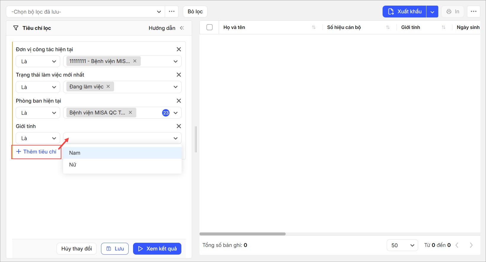3. Để thêm 1 dòng tìm kiếm nữa thì chọn Thêm tiêu chí, chọn Tiêu chí lọc. Ví dụ: Giới tính