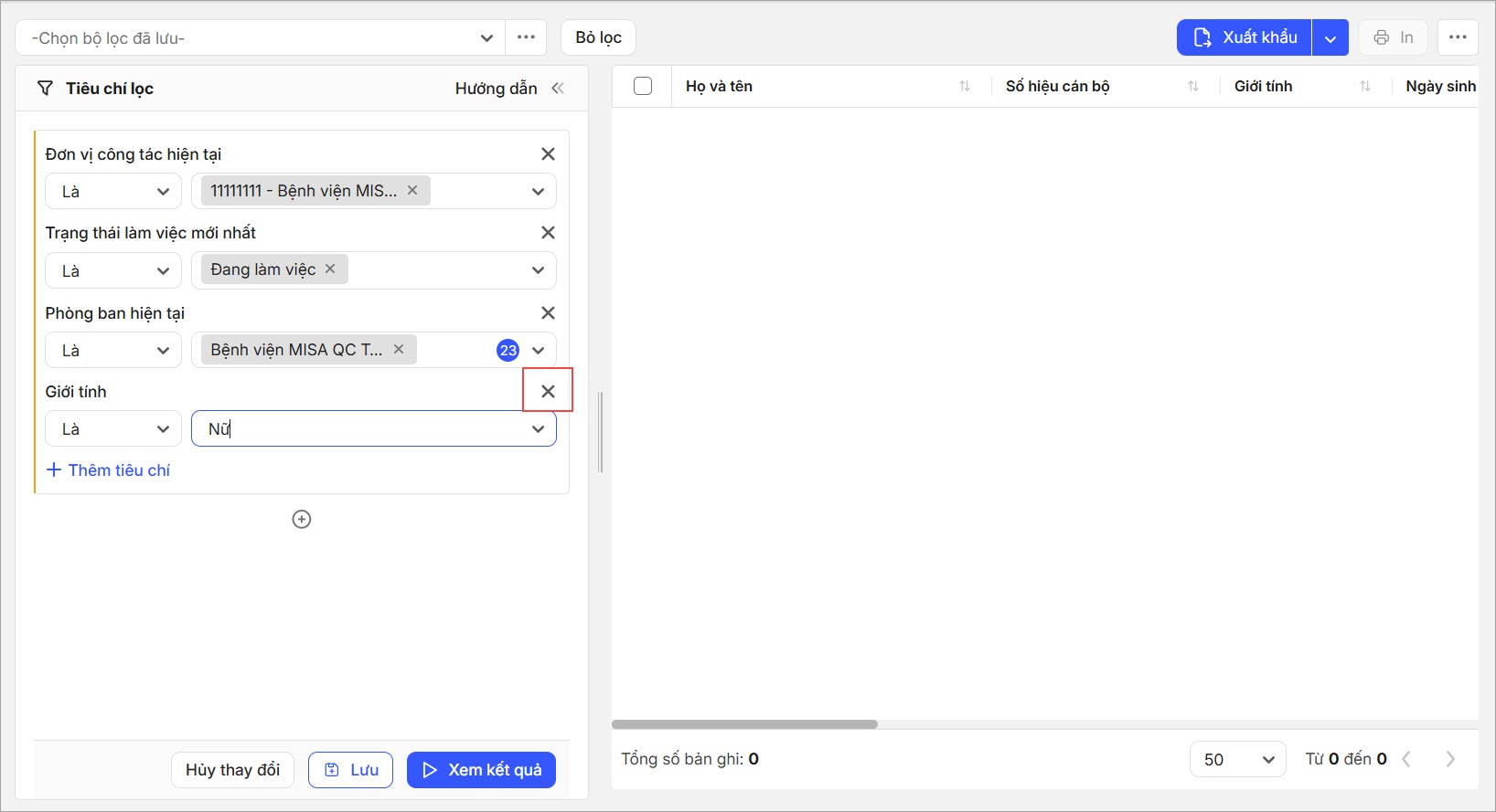 - Để xóa 1 tiêu chí lọc thì anh/chị nhấn biểu tượng dấu trừ dấu x