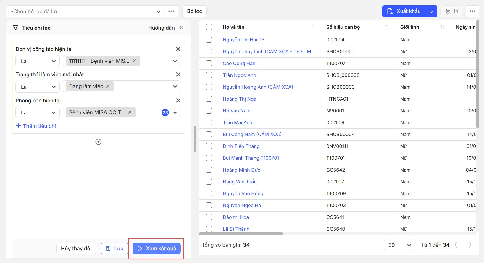 4. Nhấn Xem kết quả => chương trình sẽ lọc ra danh sách CBNV theo tiêu chí tìm kiếm.