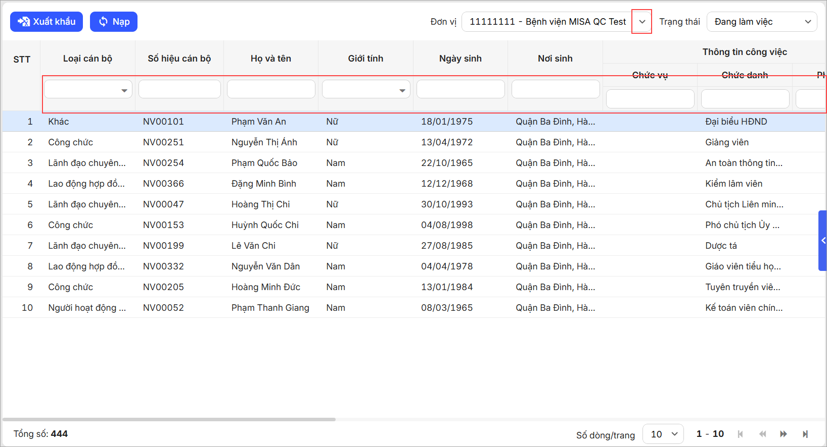 - Anh/chị có thể lọc nhanh các điều kiện tìm kiếm theo Đơn vị, Loại cán bộ, Số hiệu cán bộ, Họ và tên, Giới tính…