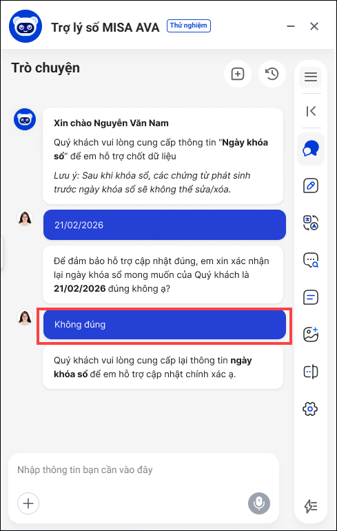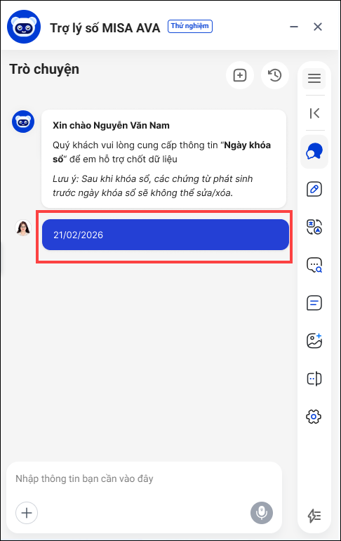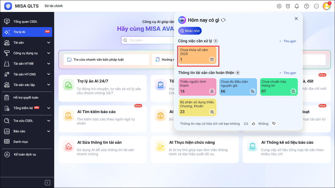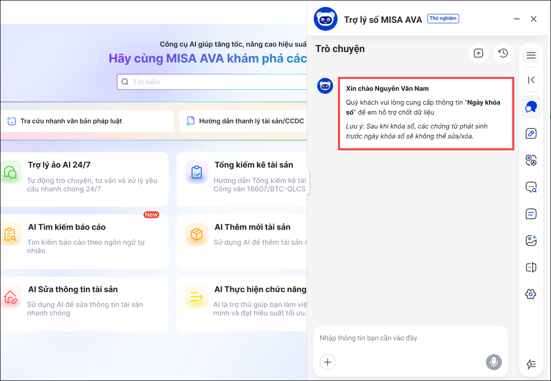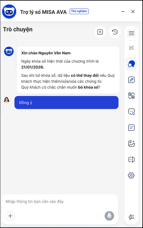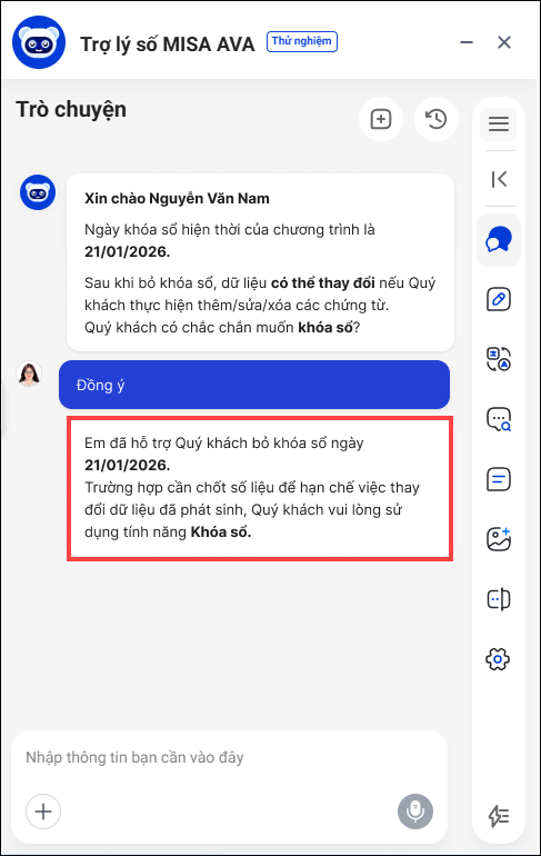 - Từ phiên bản R67: AI Agent hỗ trợ người dùng thực hiện bỏ khóa sổ/khóa sổ nhanh chóng trên phần mềm