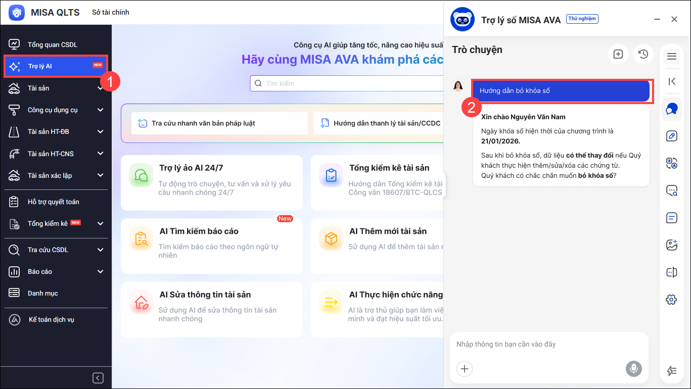Bài viết hướng dẫn cán bộ QLTS sử dụng AI Agent để thực hiện nhanh chức năng bỏ khóa sổ/Khóa sổ trên phần mềm