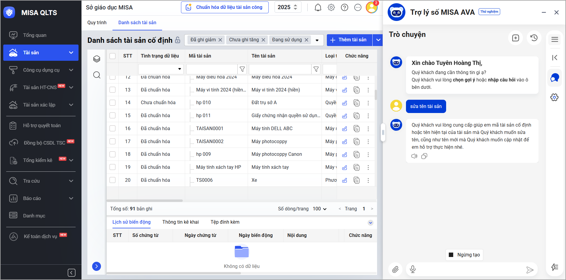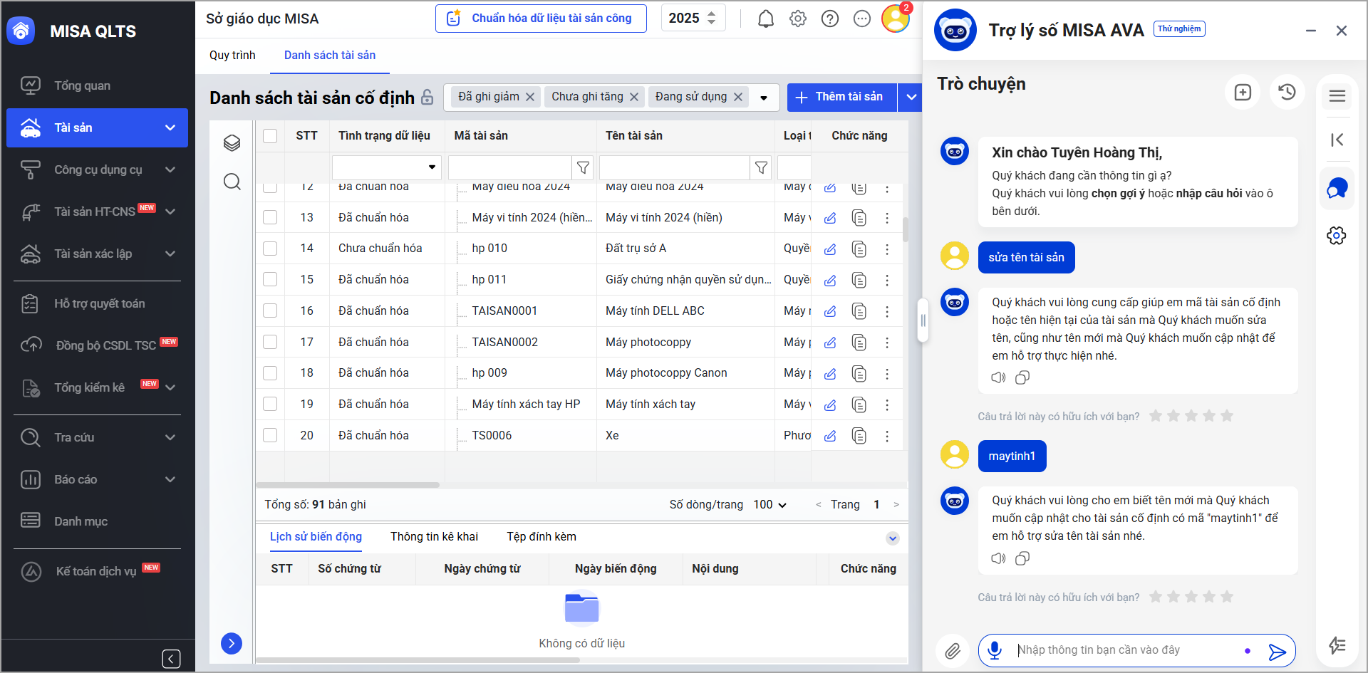 Ví dụ 1: Tôi muốn thay đổi tên tài sản, AVA sẽ hỏi các thông tin liên quan