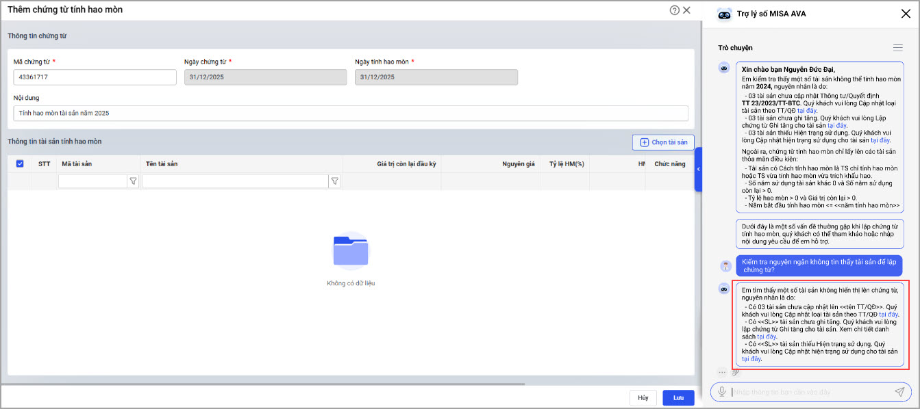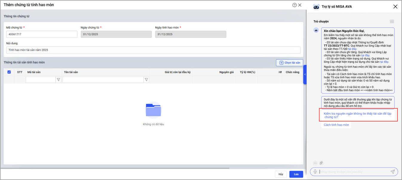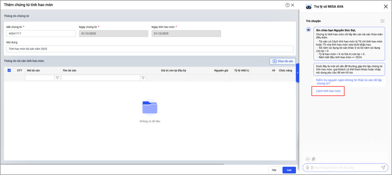 Khi lập chứng từ tính hao mòn, phần mềm sẽ hiển thị trợ lý ảo (AVA) gợi ý các câu hỏi thường gặp để giúp anh/chị hiểu rõ hơn quy trình.