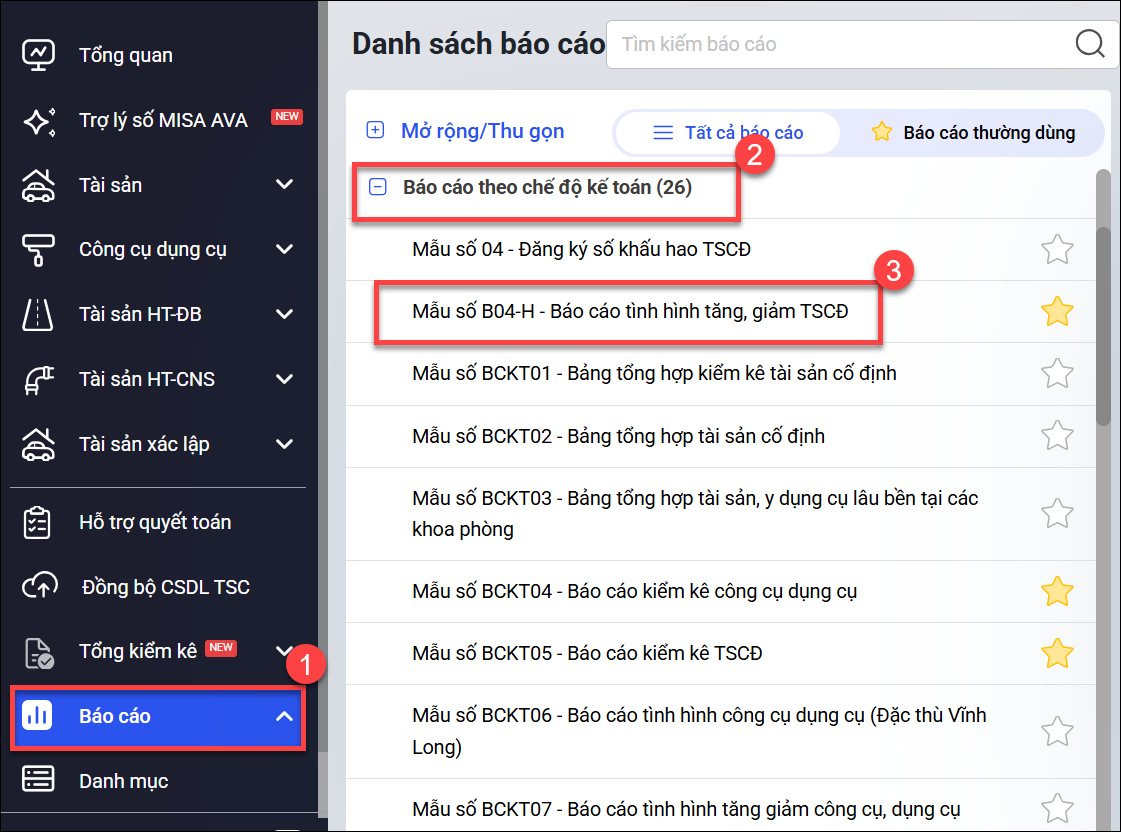 Bước 1: Vào Báo cáo\Báo cáo theo chế độ kế toán\ chọn Mẫu số B04-H – Báo cáo tình hình tăng, giảm TSCĐ.