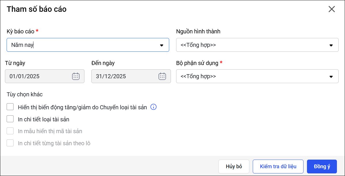 • Chọn “Tổng hợp” để hiển thị toàn bộ tài sản, không phân biệt theo bộ phận sử dụng (thường chọn tham số này).