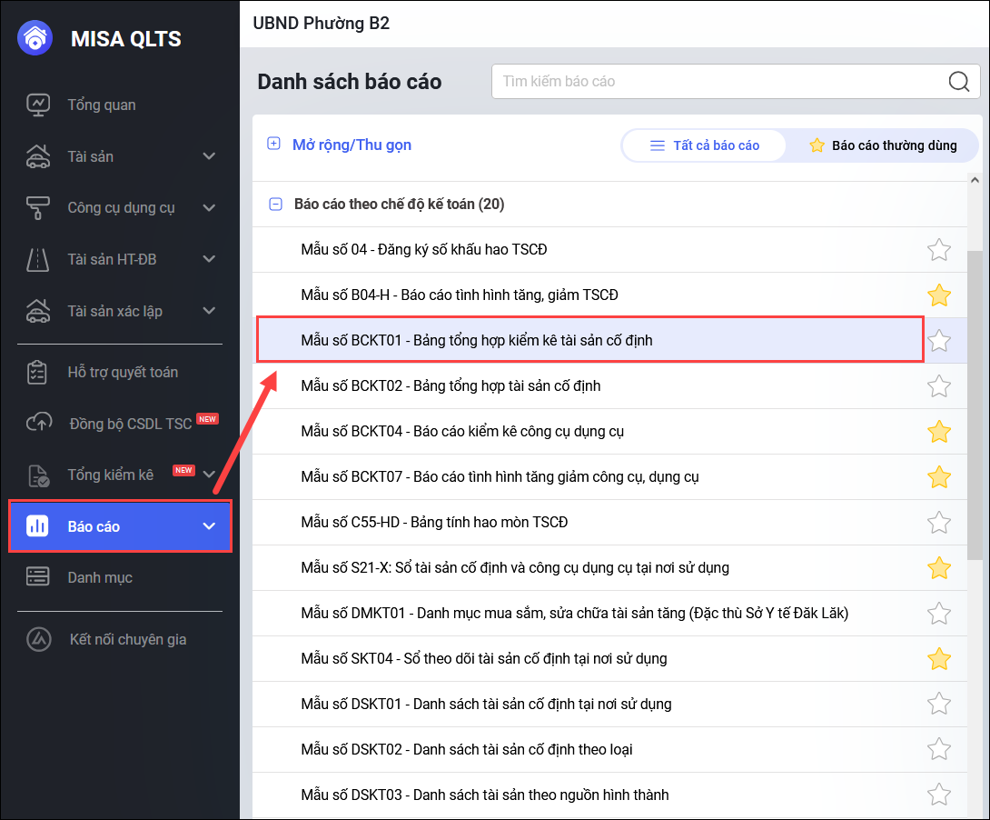 Bước 1: Vào menu Báo cáo\Báo cáo theo chế độ kế toán\chọn Mẫu số BCKT01 – Bảng tổng hợp kiểm kê tài sản cố định.