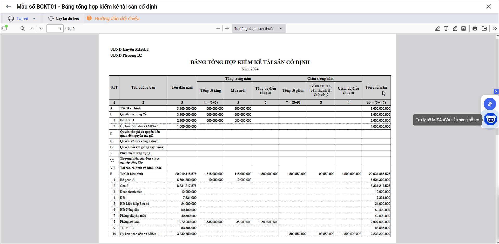 Để in được Mẫu số BCKT01 – Bảng tổng hợp kiểm kê tài sản cố định, anh/chị thực hiện các bước sau: