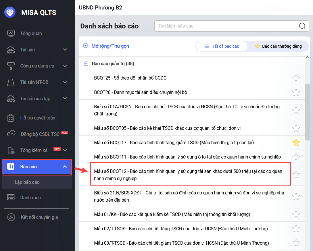 Bước 1: Vào menu Báo cáo\Báo cáo quản trị. Danh sách hiển thị Mẫu số 04-BC-TSHTĐB.