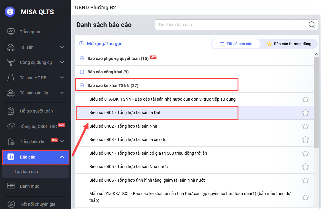 Bước 1: Vào menu Báo cáo\Báo cáo kê khai TSNN\chọn Biểu số 0401 – Tổng hợp tài sản là Đất.