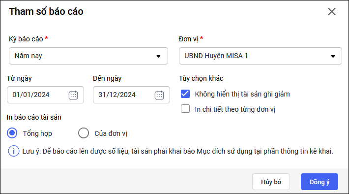 - Chọn in báo cáo tài sản Tổng hợp hay in Của đơn vị.