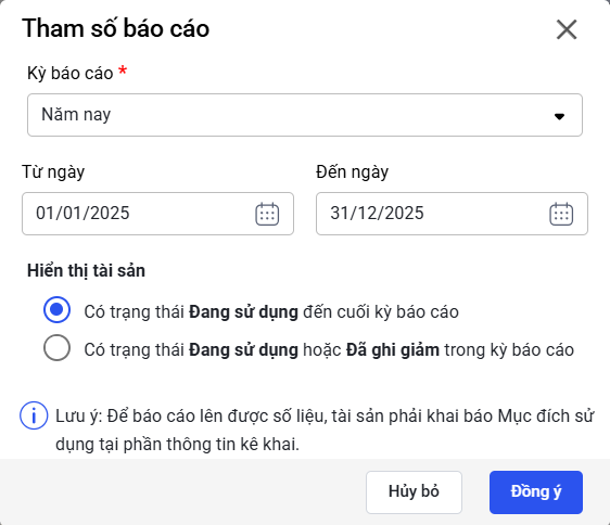 - Nếu tích chọn “Có trạng thái Đang sử dụng đến cuối kỳ báo cáo” phần mềm chỉ lấy lên tài sản đang được sử dụng tại đơn vị và không lấy các tài sản đã ghi giảm đến cuối kỳ báo cáo theo đúng yêu cầu của đơn vị cấp trên.