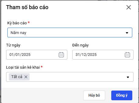 - Chọn loại tài sản cụ thể nếu chỉ muốn xem báo cáo tài sản thuộc loại đó.