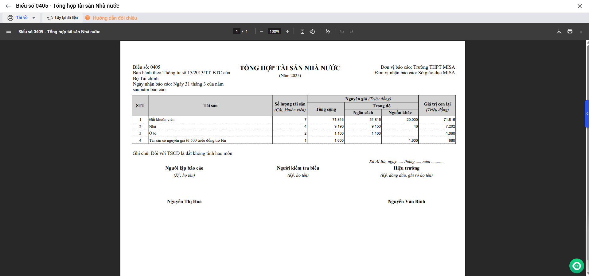 - Số lượng và nguyên giá lấy theo danh sách tài sản khi khai báo tài sản tại đây.