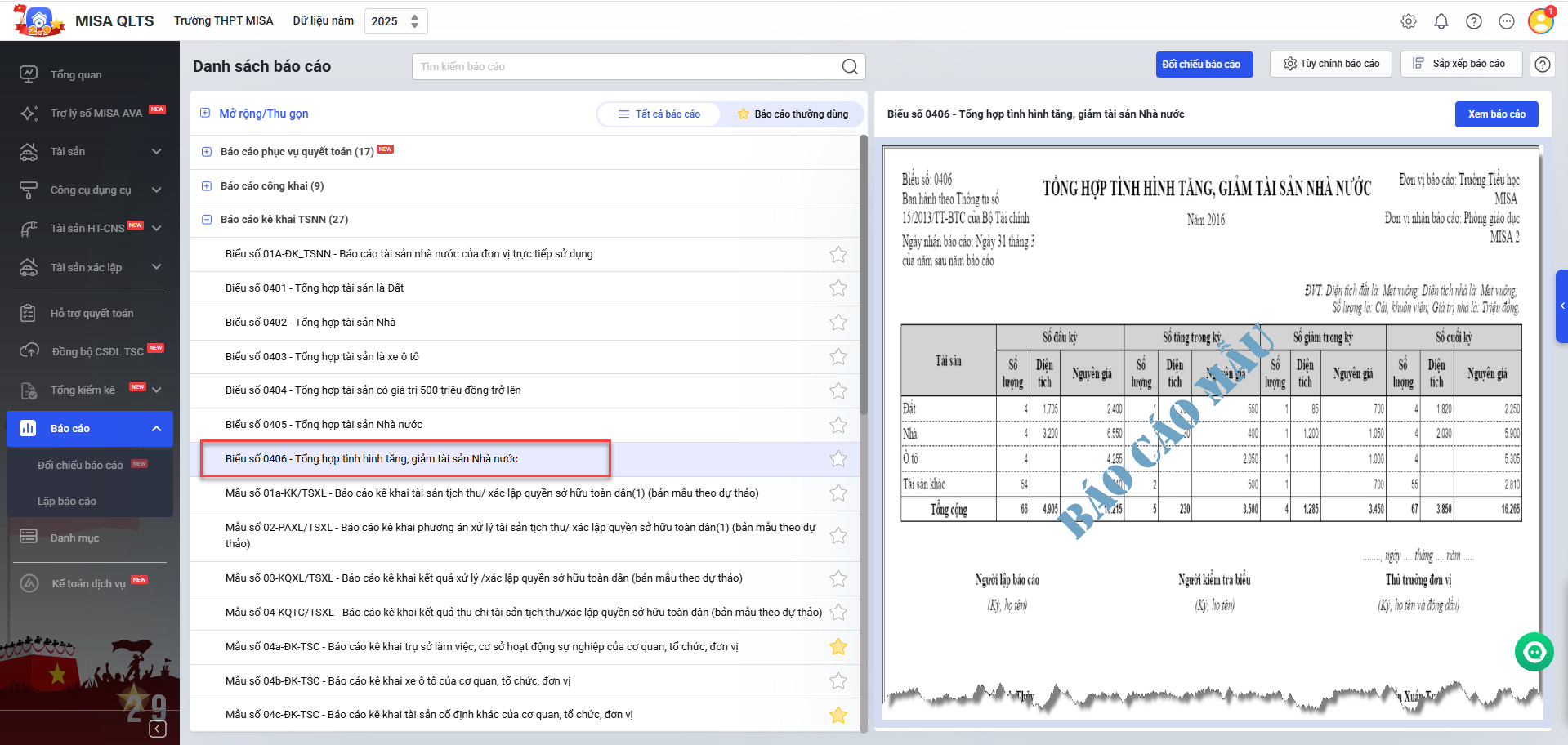 Bước 1: Vào menu Báo cáo, chọn Báo cáo kê khai TSNN, tại đây phần mềm đã bổ sung Báo cáo Biểu số 0406 – Tổng hợp tình hình tăng, giảm tài sản Nhà nước.