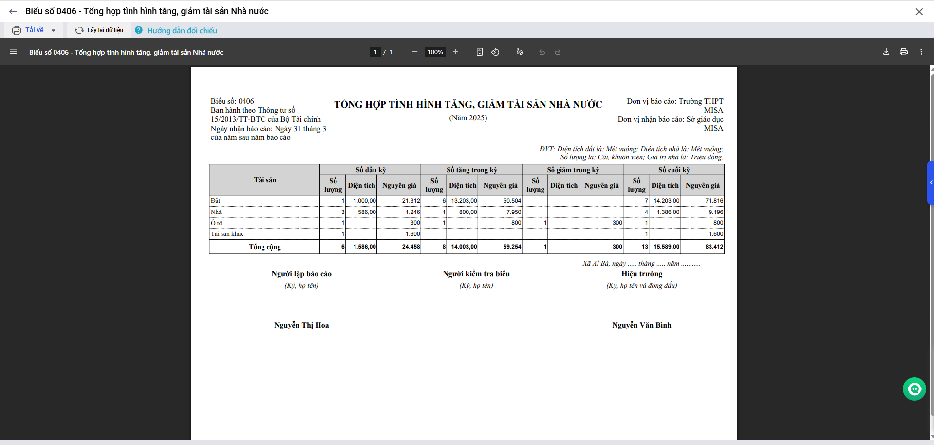 4. Biểu số 0406 – Tổng hợp tình hình tăng, giảm tài sản Nhà nước