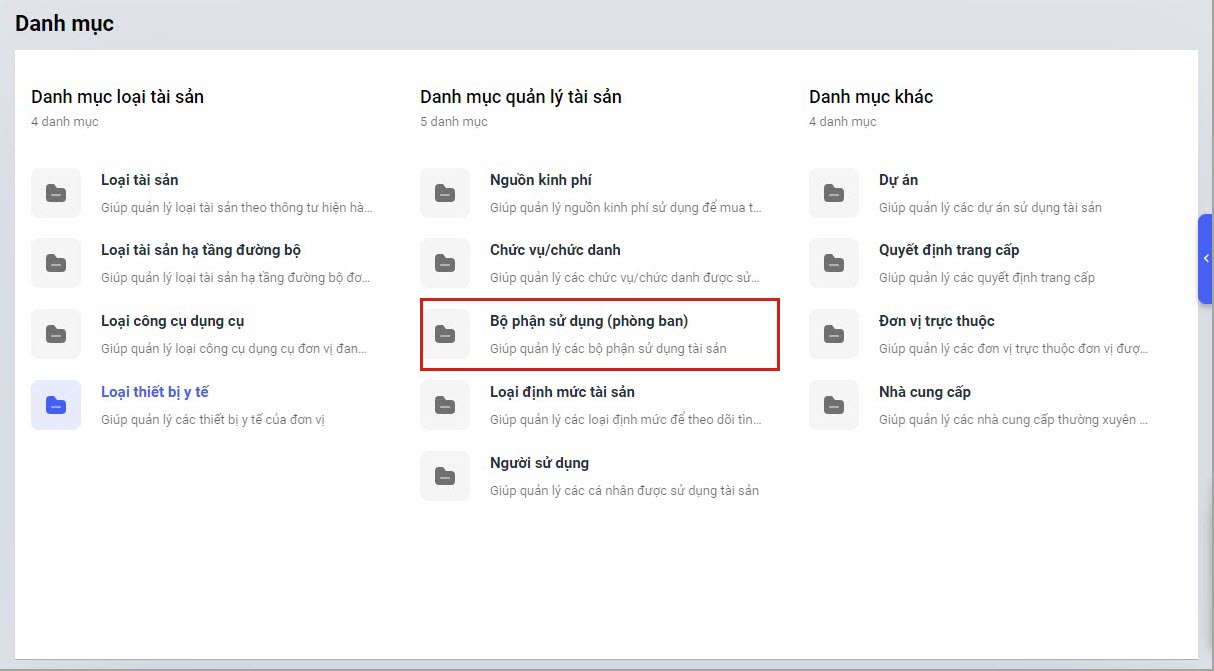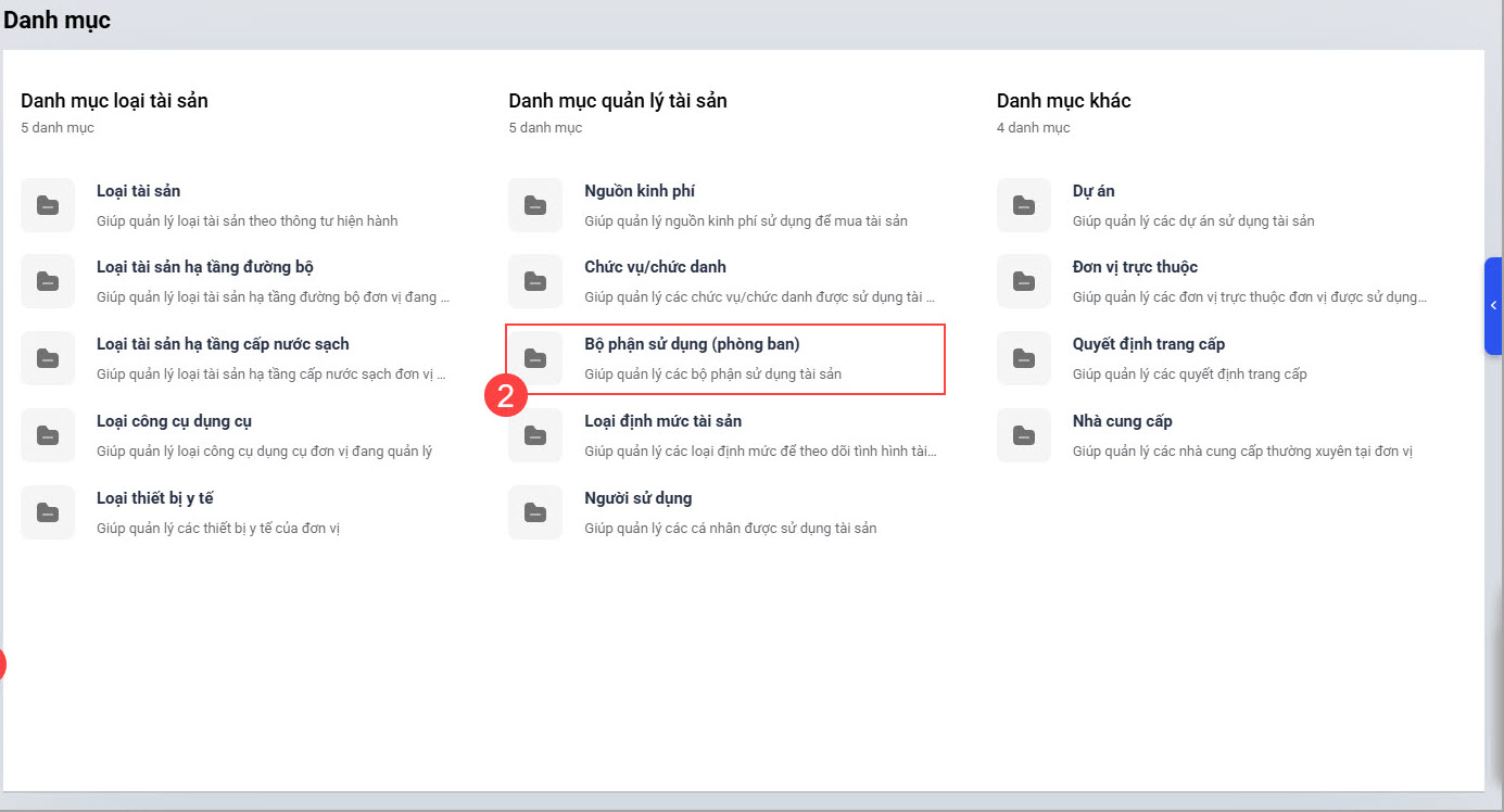 Bước 1: Vào Danh mục\Bộ phận sử dụng (phòng ban).