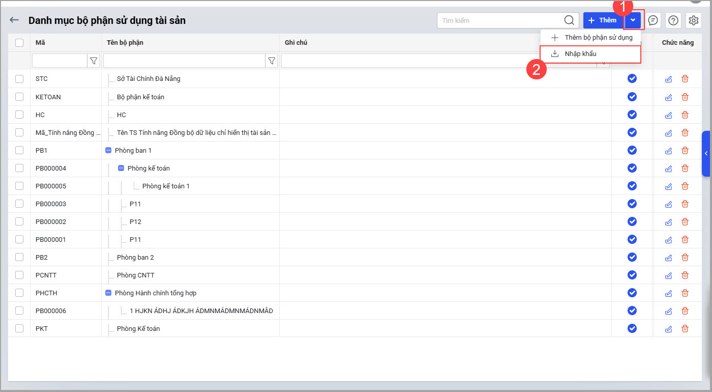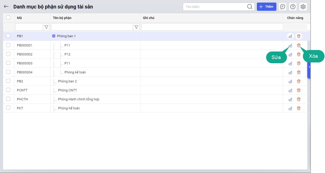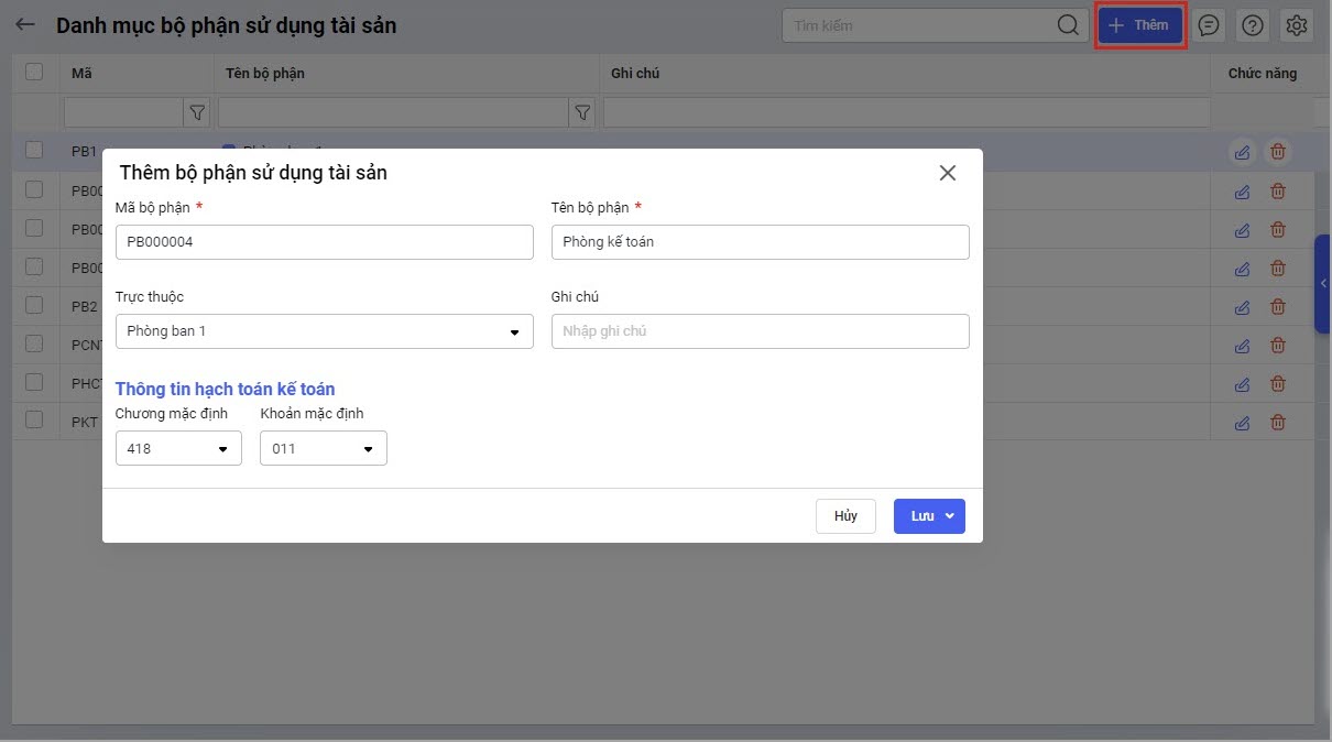 Bước 2: Nhấn Thêm để thêm mới bộ phận sử dụng (phòng ban).