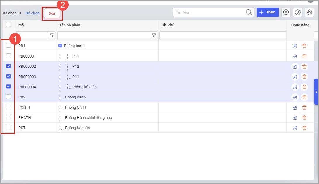 - Tích chọn các phòng ban cần xóa.