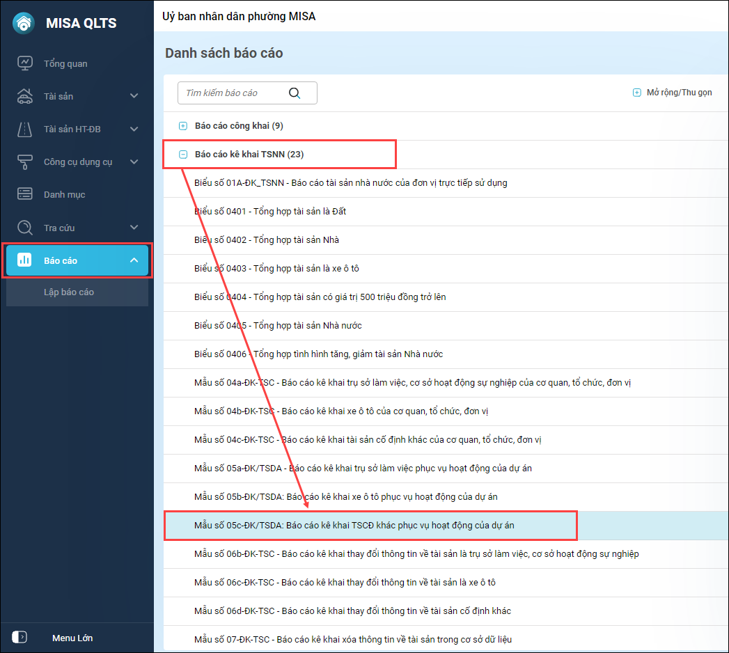 Bước 1: Vào menu Báo cáo\Báo cáo kê khai TSNN\chọn Mẫu số 05c-ĐK/TSDA: Báo cáo kê khai TSCĐ khác phục vụ hoạt động của dự án.