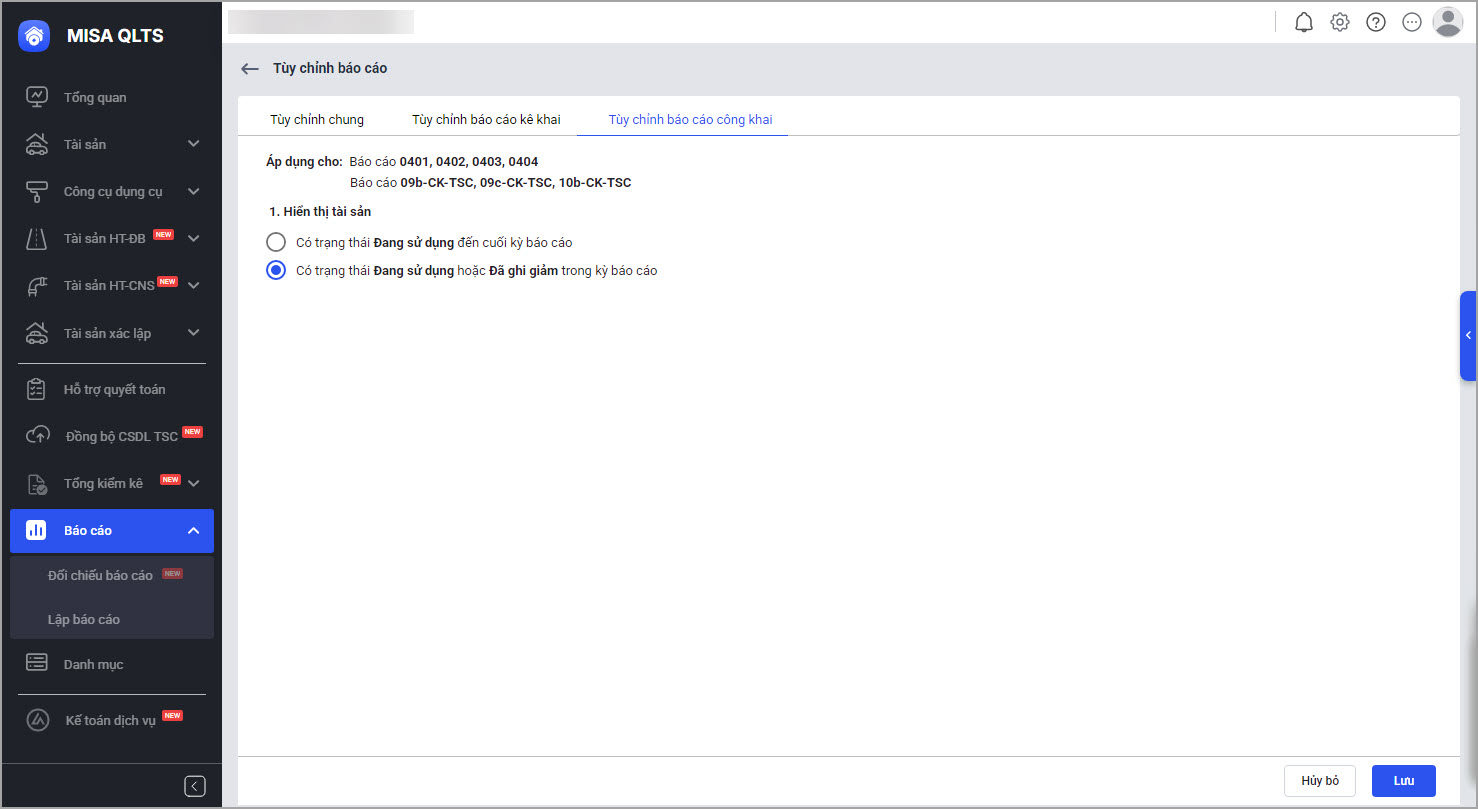Khi lập báo cáo công khai, kê khai, anh/chị có thể mặc định chỉ chọn các tài sản đang sử dụng tại đơn vị để đáp ứng đúng yêu cầu đặc thù của đơn vị chủ quản.