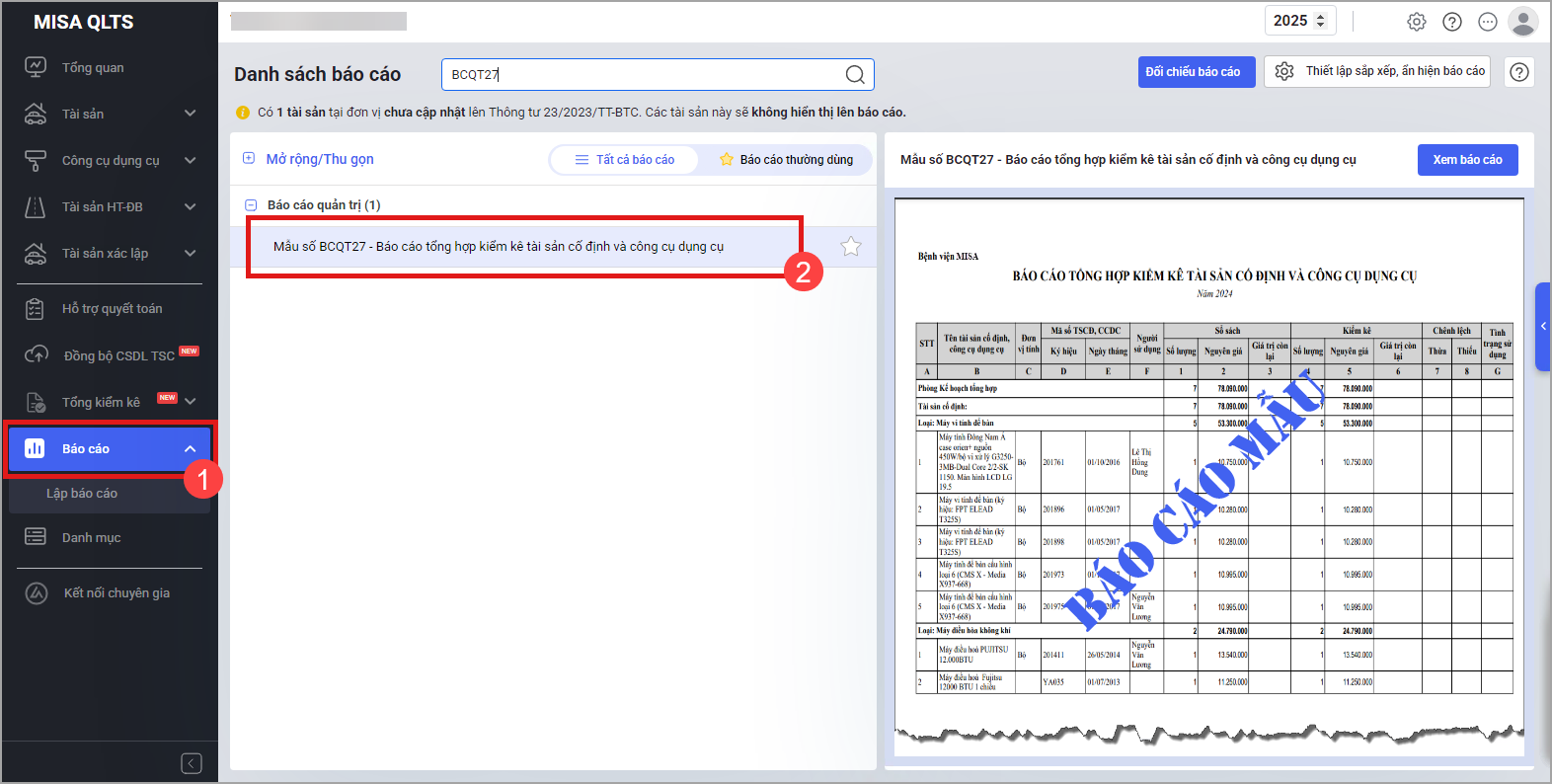 - Anh/chị phải lập chứng từ kiểm kê tài sản và kiểm kê CCDC trước khi in báo cáo.