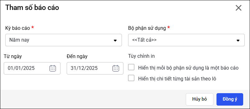 Tại mục Bộ phận sử dụng: chọn Tổng hợp hoặc phòng ban cụ thể (ví dụ: Phòng Kinh tế)