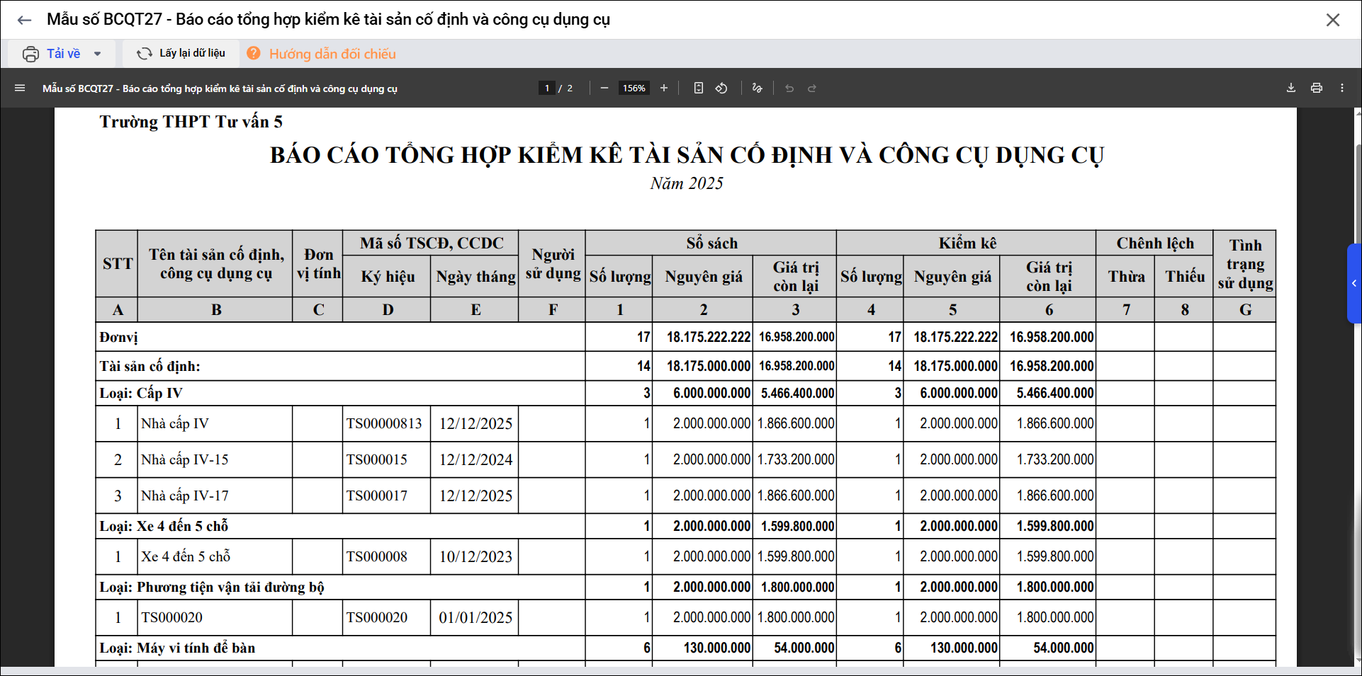 Số liệu theo thực tế kiểm kê: Số lượng, nguyên giá, giá trị còn lại ghi nhận khi kiểm kê thực tế