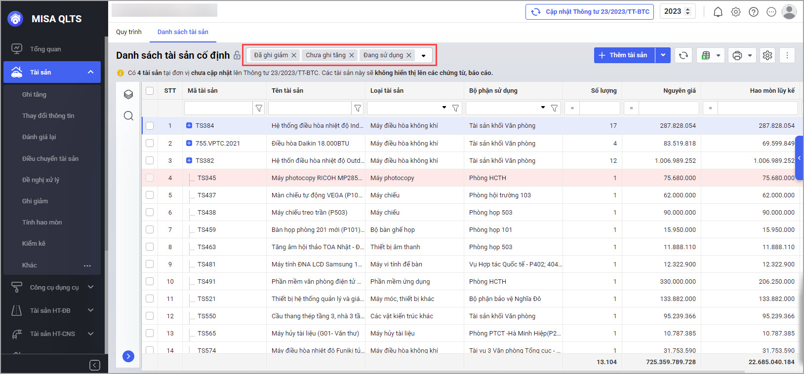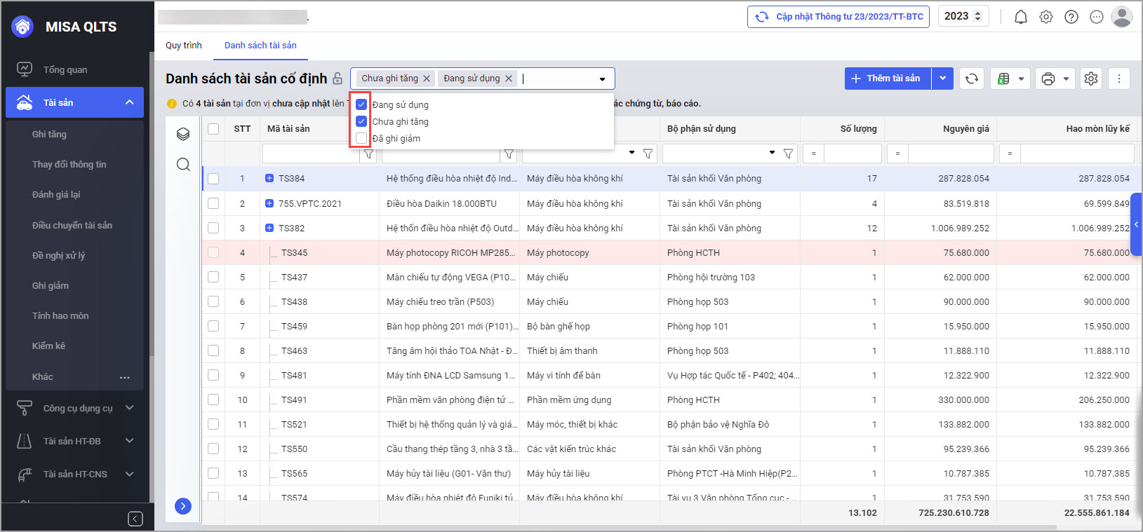Phần mềm cho phép lọc nhanh danh sách tài sản theo trạng thái để phục vụ nhu cầu quản lý.