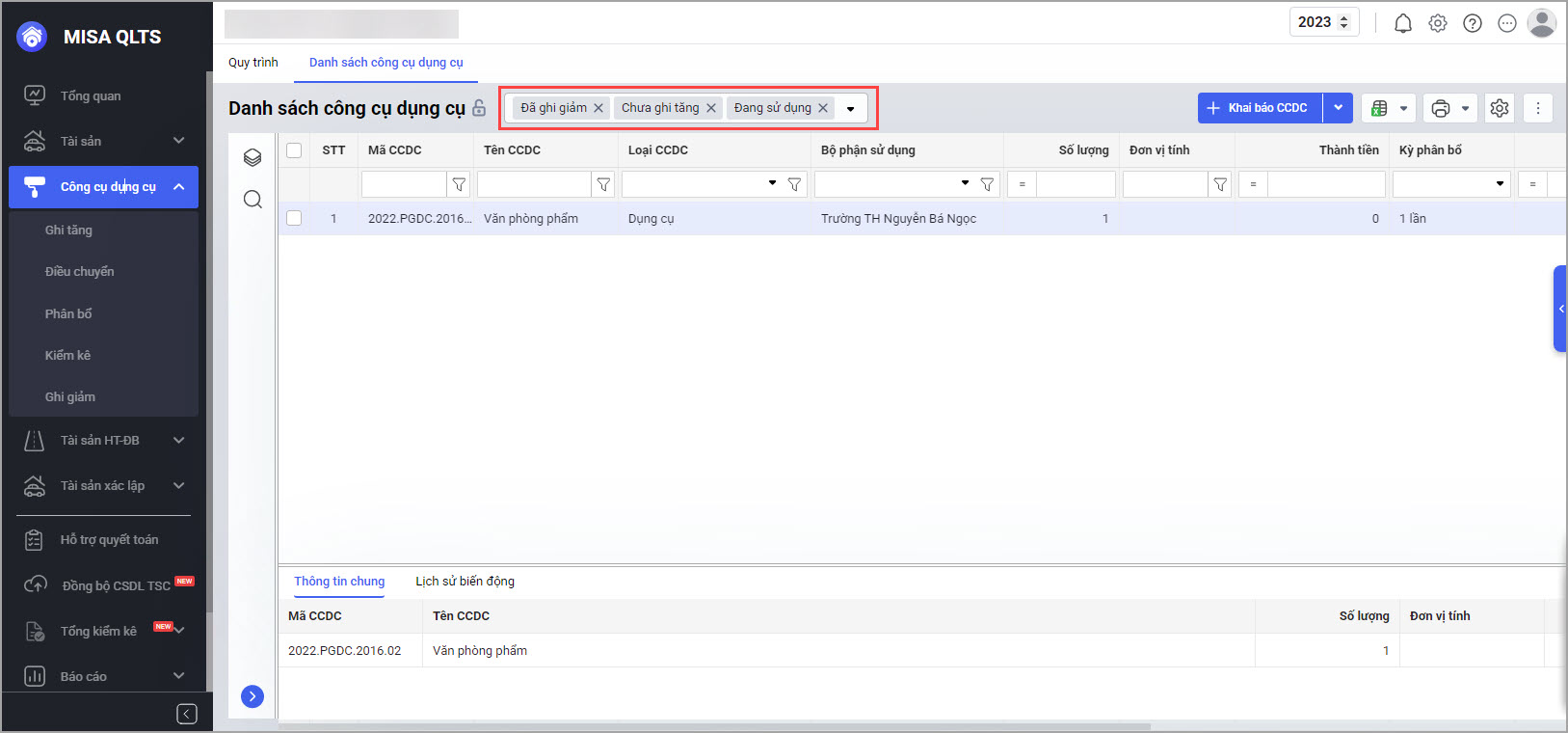 • Đã ghi giảm: CCDC đã được giảm giá trị hoặc ghi giảm khỏi danh mục CCDC.