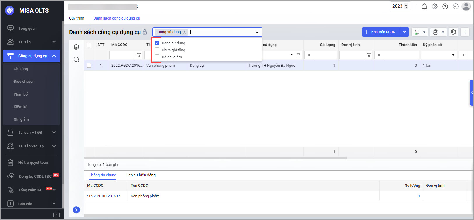 • Vào Danh sách công cụ dụng cụ → tích các ô trong bộ lọc Trạng thái (Chưa ghi tăng/Đang sử dụng/Đã ghi giảm) → hệ thống sẽ hiển thị theo lựa chọn.